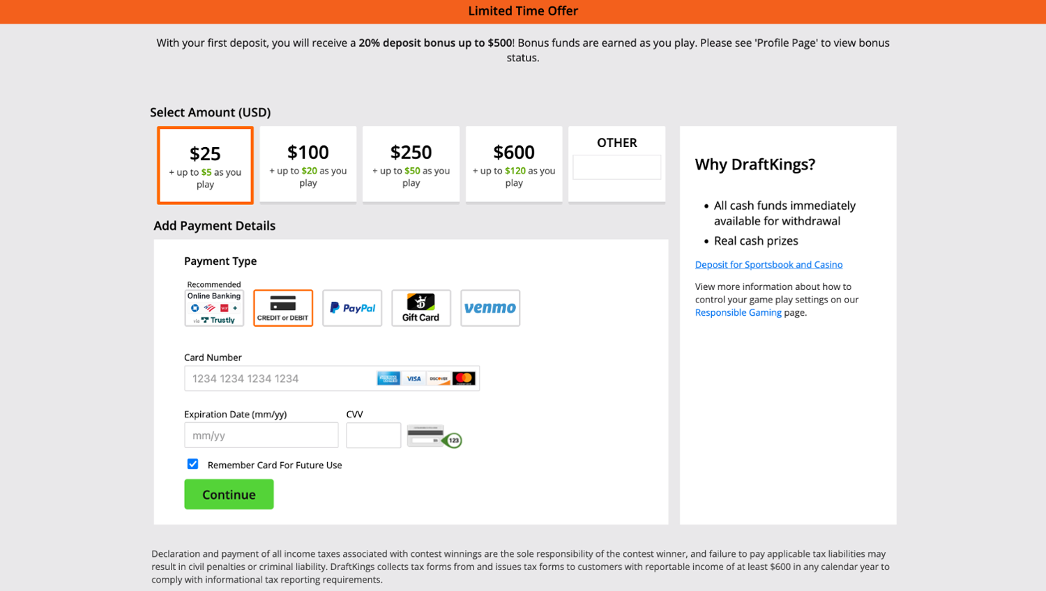 After deciding which credit card deposit casino to play at, all I'd need to do is click on the deposit button. In most casinos, such as DraftKings, the balance section is a clickable link that also directs you to the deposit page.